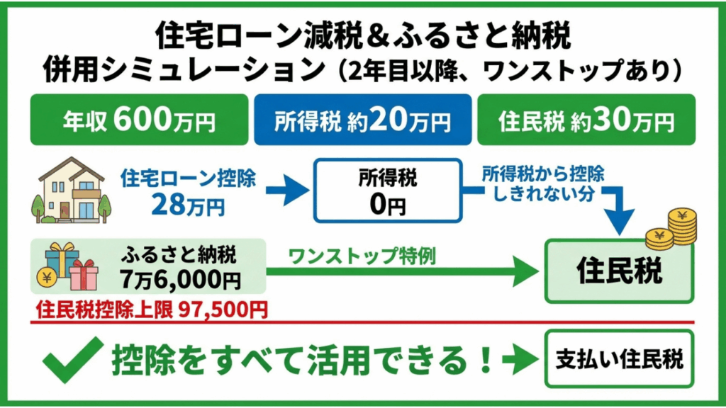 また、住宅ローン減税(控除)は所得税→住民税という順番で控除されるのに対し、ワンストップ特例制度を利用したふるさと納税は全額住民税から控除されます。