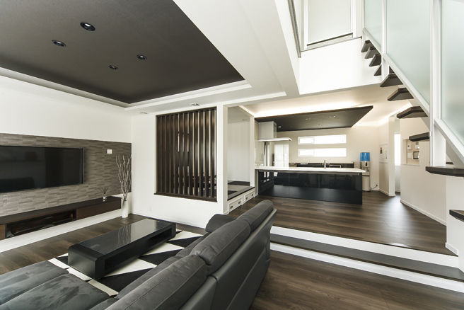 一番のこだわりはあえて段差をつけて低くしたリビング。キッチンとスムーズにつながりながらも、独立した空間が広がっている