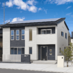 窓の形状や配置にもこだわった個性的な外観。5.4kWの太陽光発電パネルを搭載