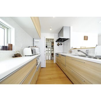 広々としたキッチンスペース。奥にはたっぷり収納できるパンドリーも
