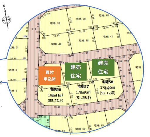 | 土地面積 | 【宅地56】183.33㎡(55.46坪) 【宅地57】170.31㎡(51.52坪) 【宅地58】172.90㎡(52.30坪) |
