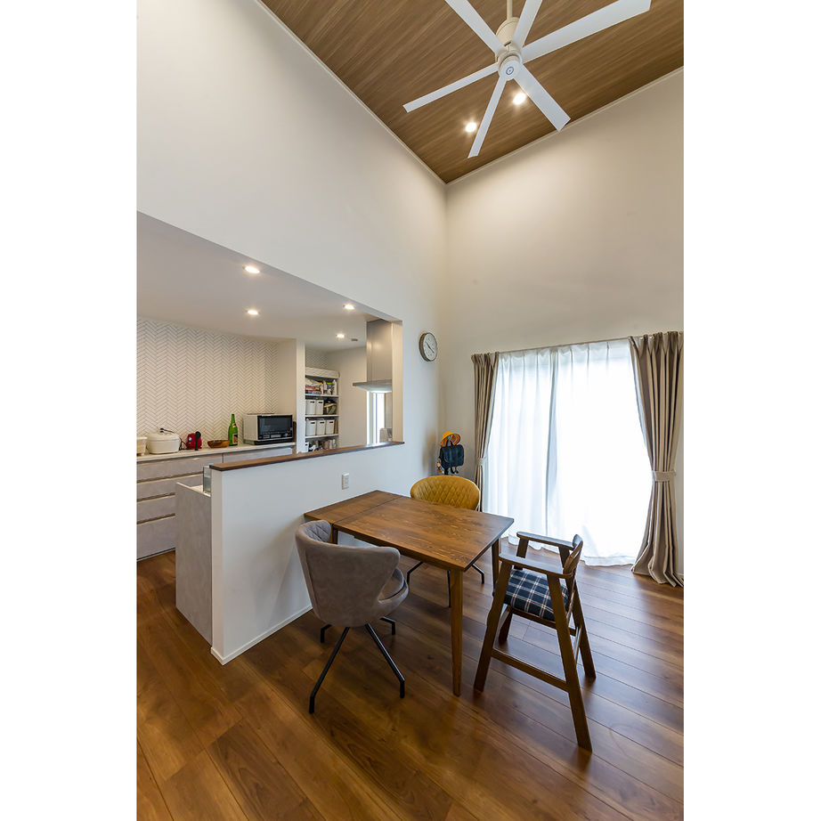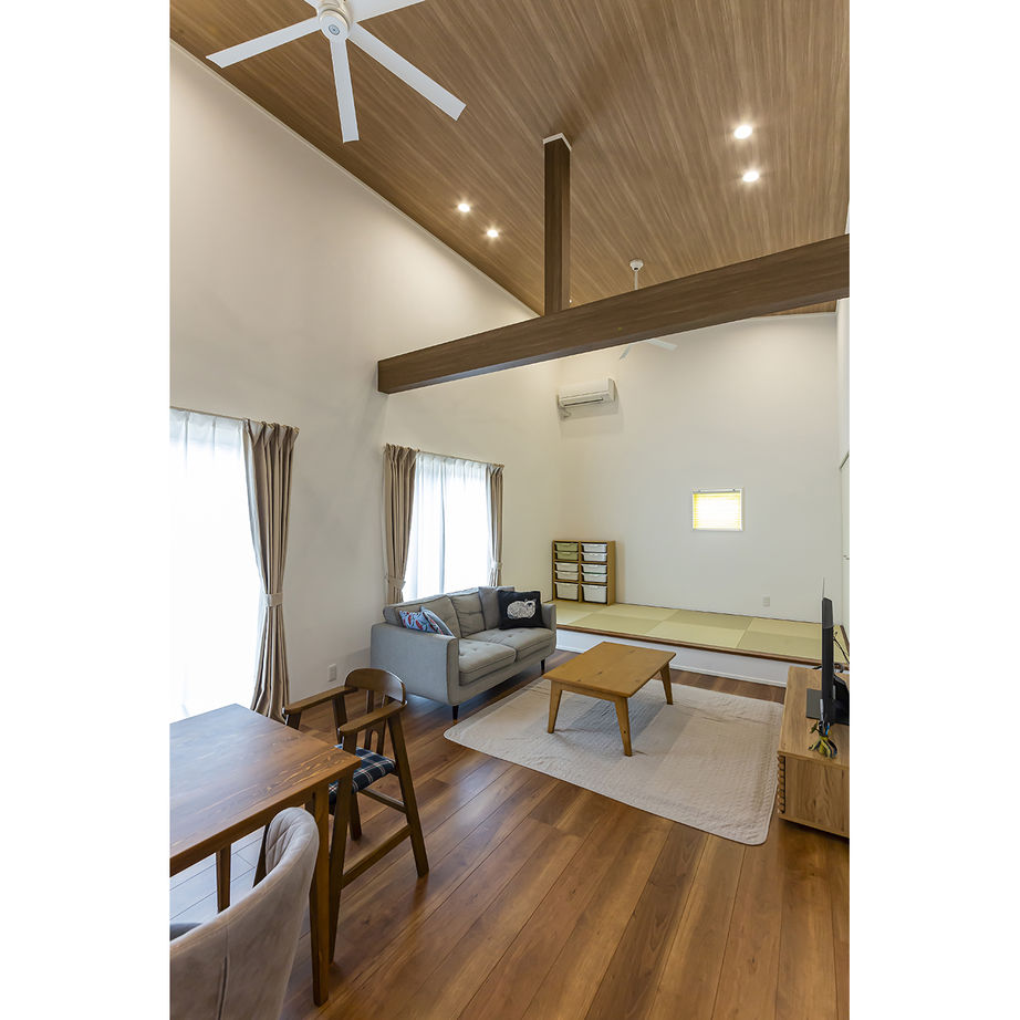 勾配天井が開放感をもたらすリビング・ダイニング。大きな窓からたっぷり自然光が取り込める