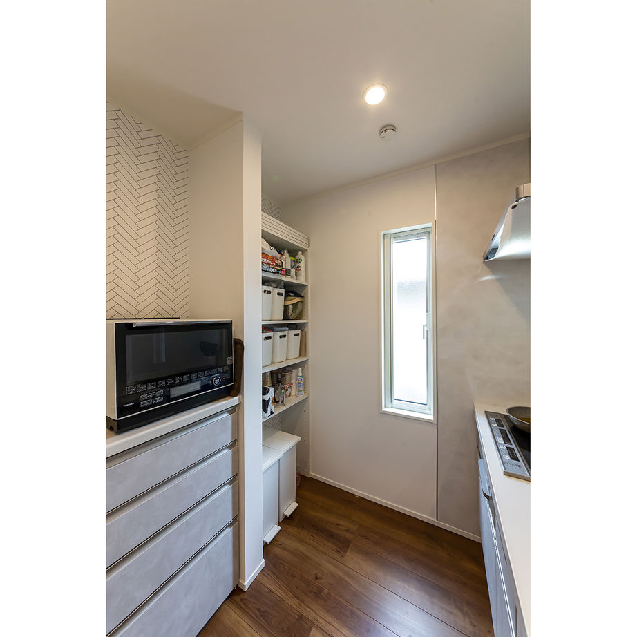 キッチンの奥には広めの収納スペースを設置。日用品や保存食品のストックに便利