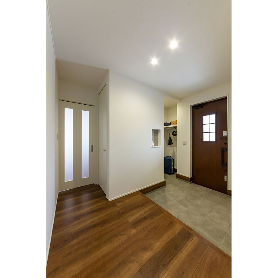 玄関には家族の靴やアウトドアグッズもしまえるシューズクロークを設置。ホールも広々としている