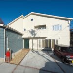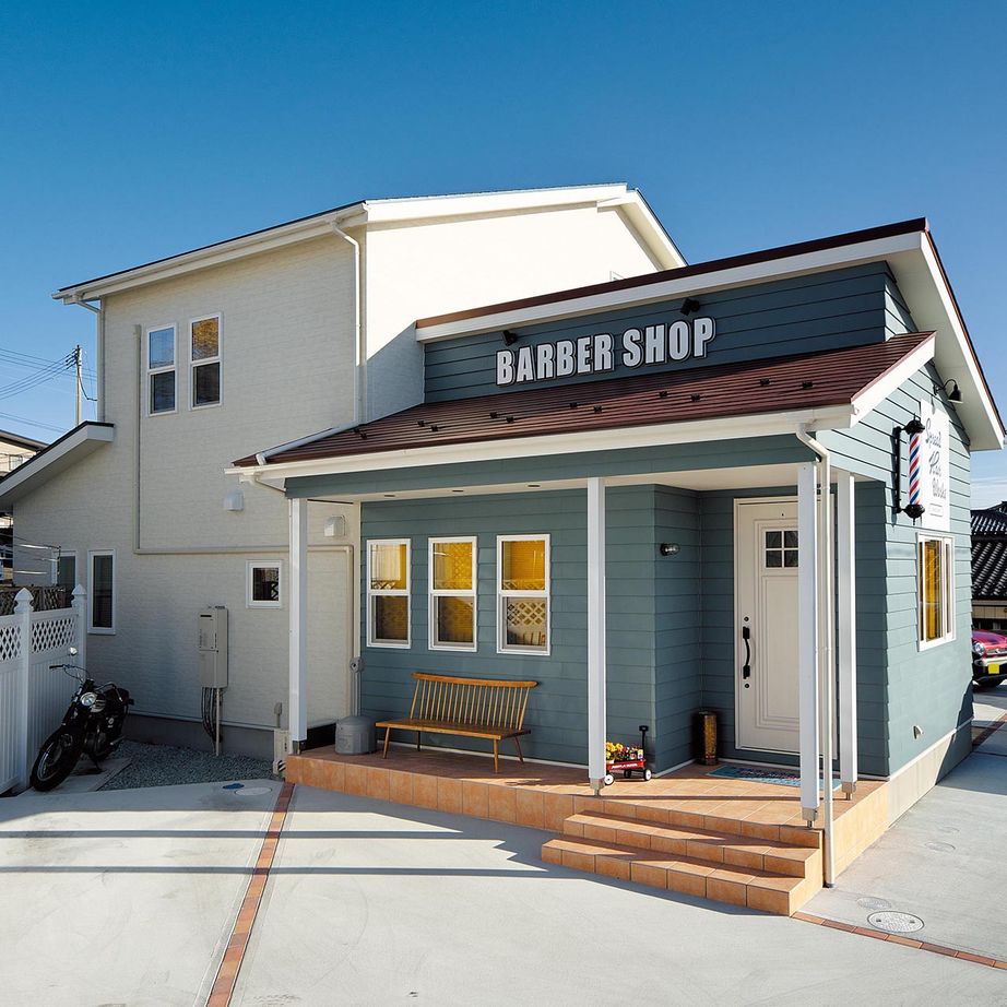 店舗側から見た外観。白を基調に店舗部分だけ外壁の色を変えているのが特徴