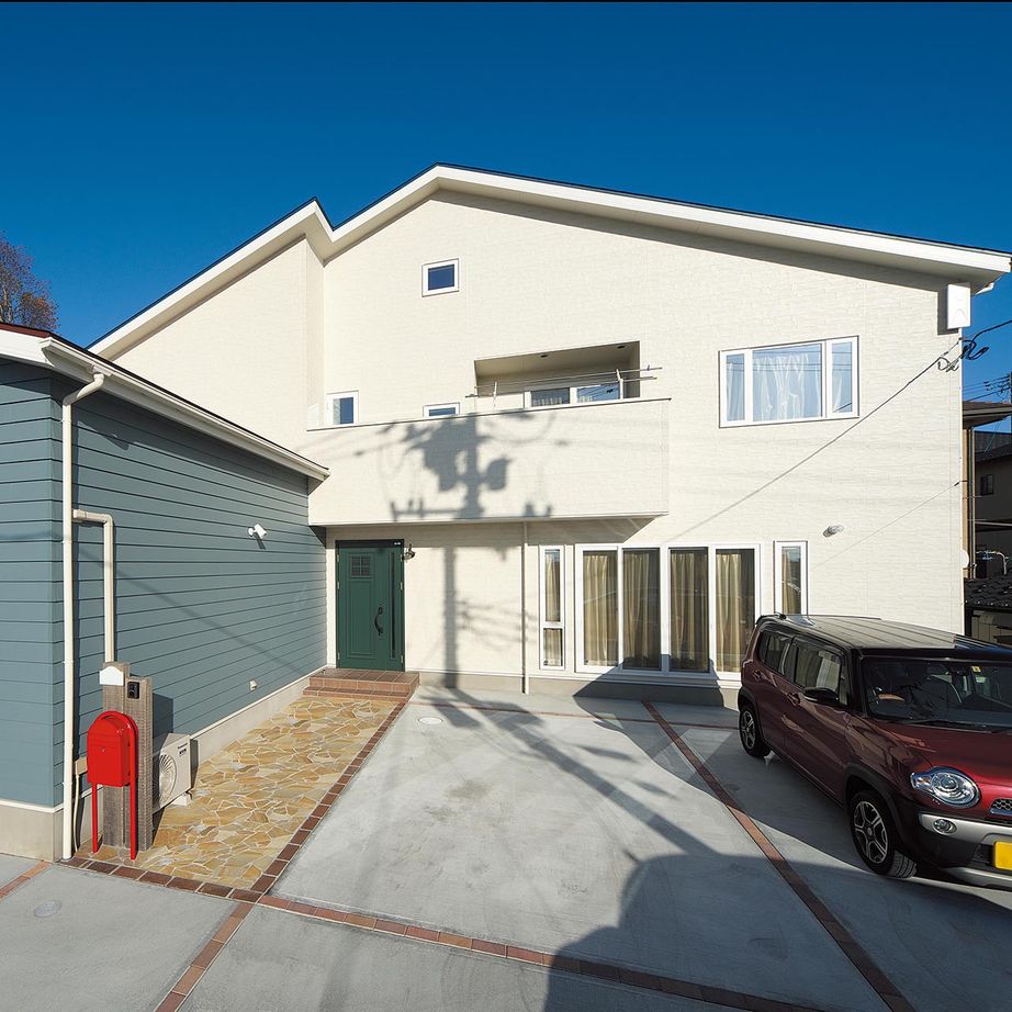 住居側から見た外観。窓の形状や位置にこだわり、個性のあるデザインに仕上げている