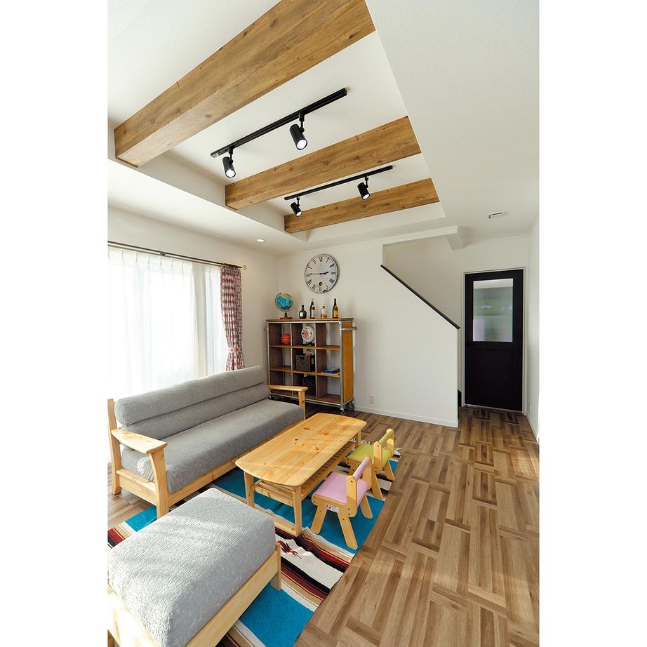 折上天井や表しの梁が印象的なリビングは、家族7人でゆったりと寛げる広さ